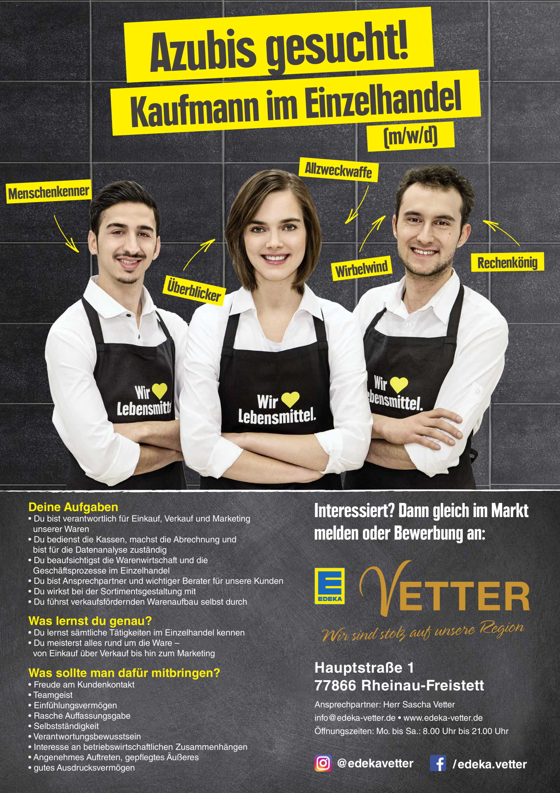 Sende uns jetzt deine Bewerbung an info@edeka-vetter.de und werde Teil unseres Teams.
